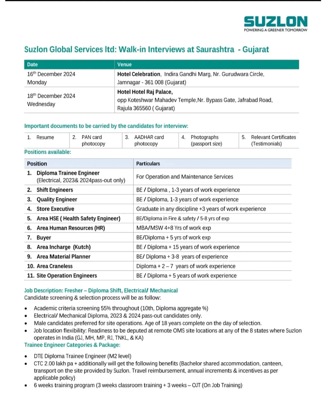- Electrical/ Mechanical Diploma, 2023 & 2024 pass-out candidates only.
